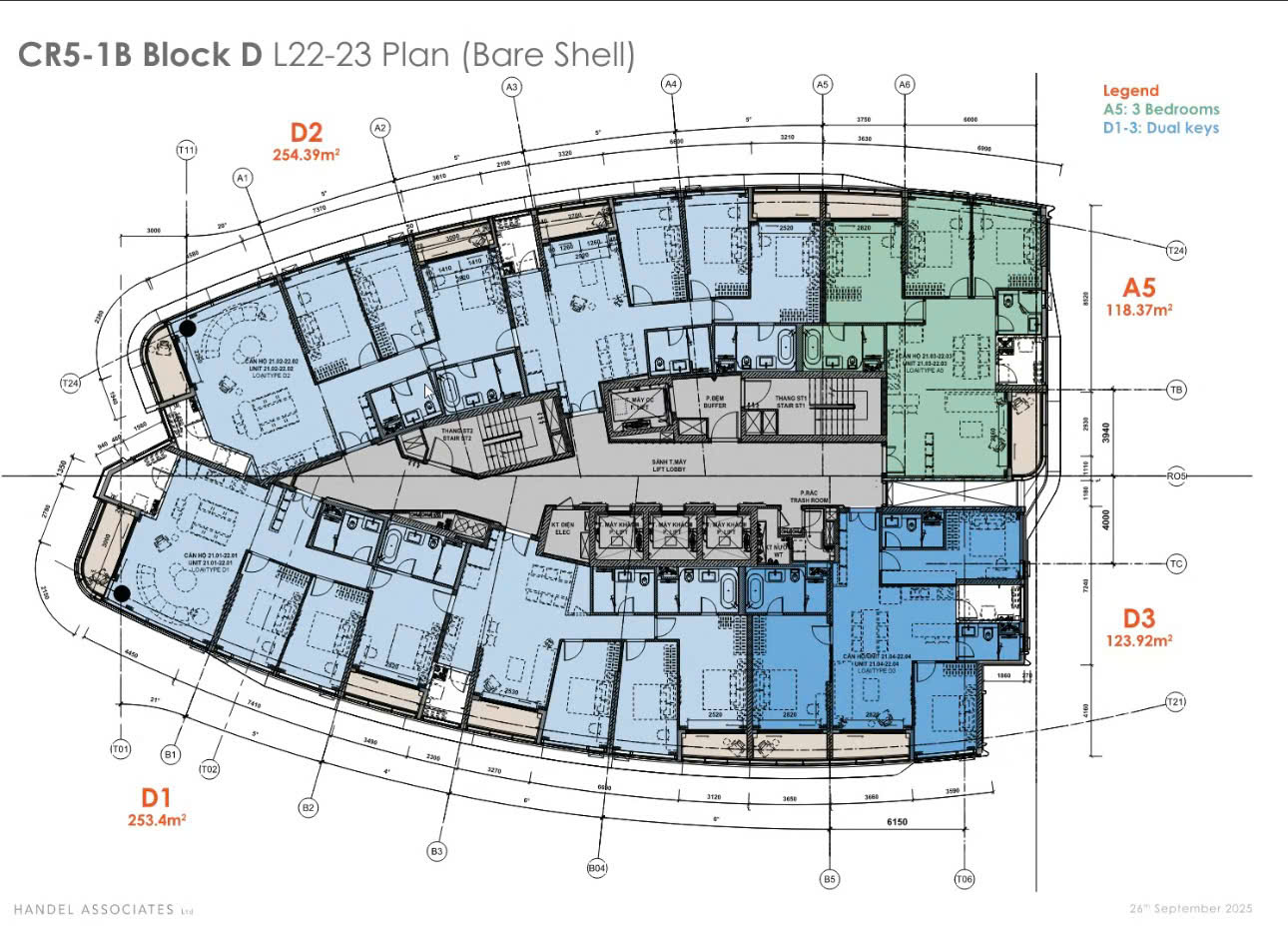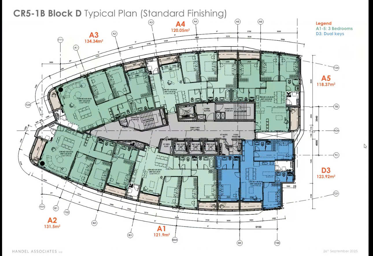 Tầng 5-21 : Toàn bộ đều là căn hộ 3 Phòng Ngủ , Diện tích từ 118m2 – 135 m2