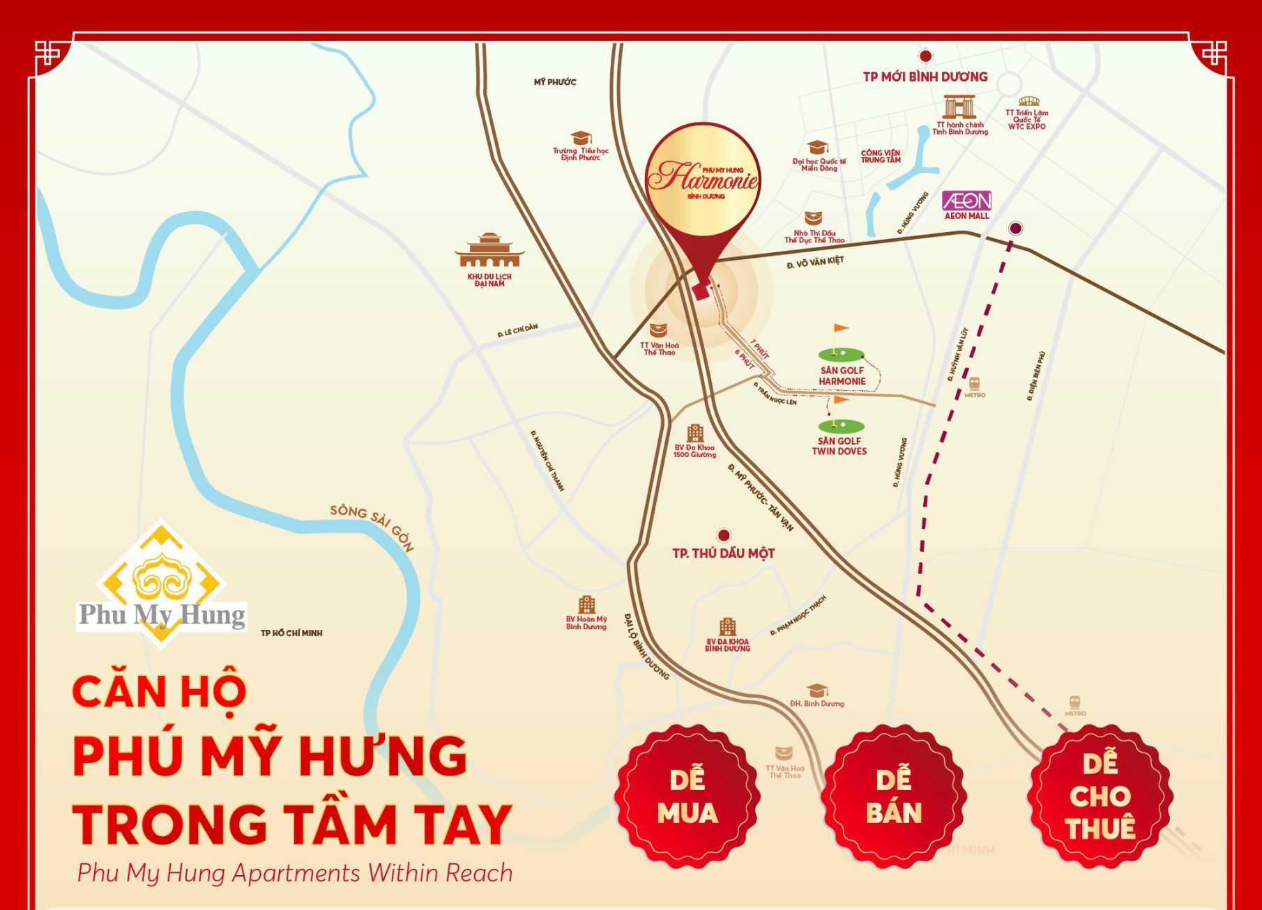 05 phút đến AEON Mall Bình Dương, Sân Golf Harmonie, Đại học Quốc tế Miền Đông